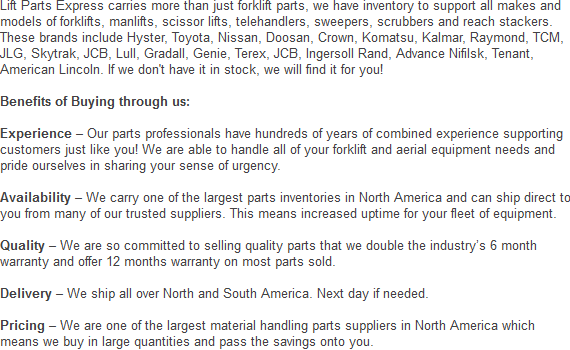 For your entire fleet of lift trucks, we provide the best deals on all our parts. If you are interested in receiving a quote for our parts or attachments, give us a call now at: